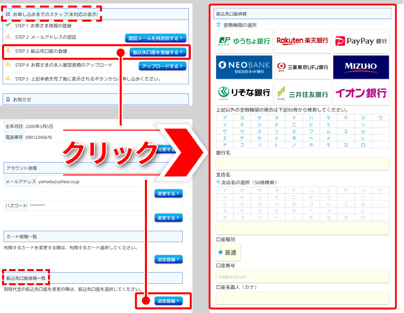 買取代金の振込先口座を登録する方法について解説します。アカウントに登録されたお名前と口座名義が異なる場合は、買取の申し込みをお受けできませんのでご注意ください。