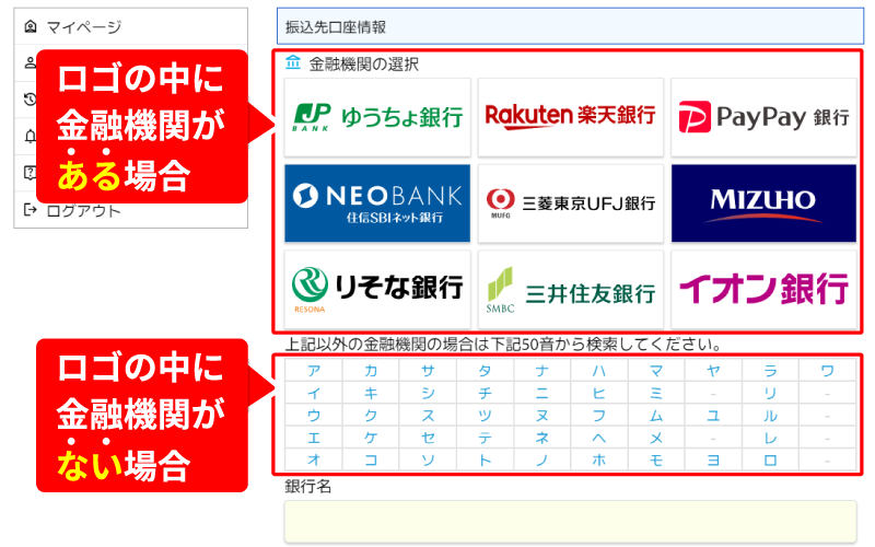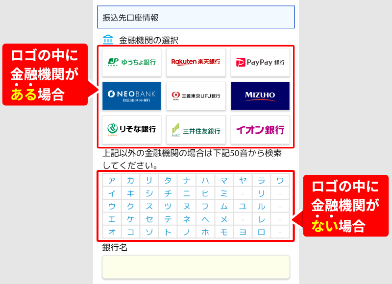 ロゴ画像か50音表でご利用の金融機関を選択