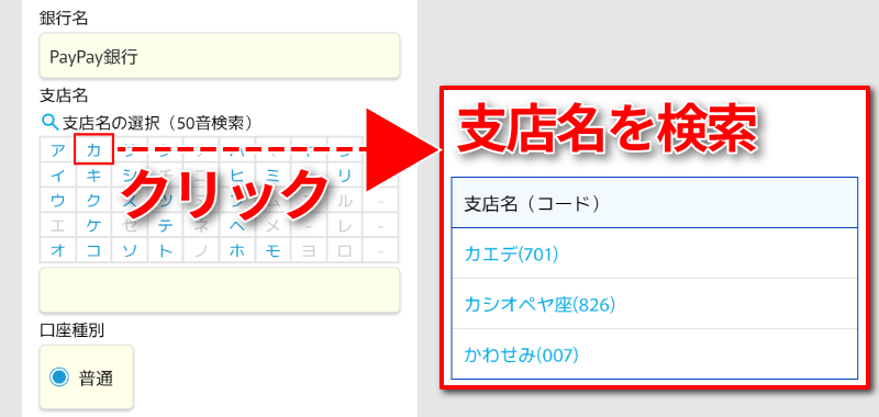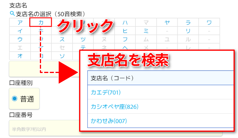 金融機関を選択すると、「支店名」を検索するための50音表が表示されます。そこから支店名を検索してください。