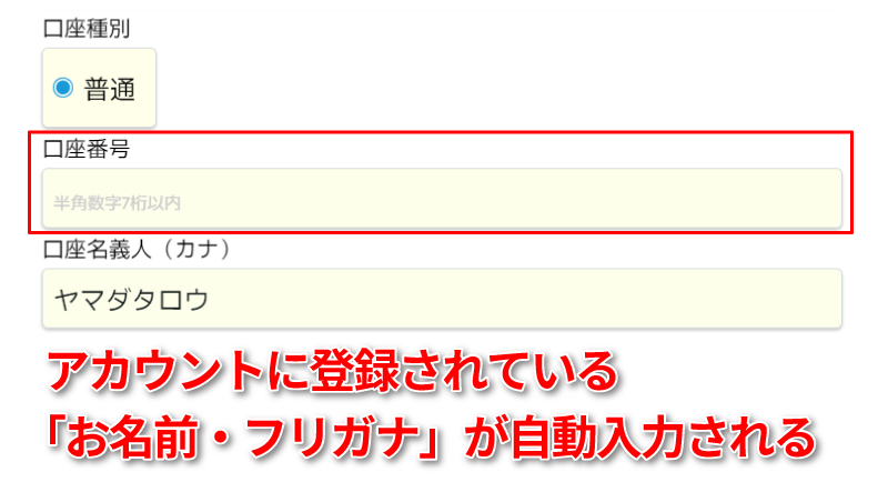 「口座名義人」にはアカウントに登録されている「お名前・フリガナ」が自動入力されます。