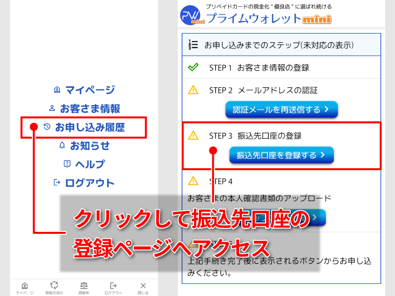 まずはマイページトップの「お申し込みまでのステップ」または「お客さま情報」ページにあるリンクから、振込先口座の登録ページへアクセスしてください。