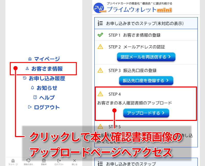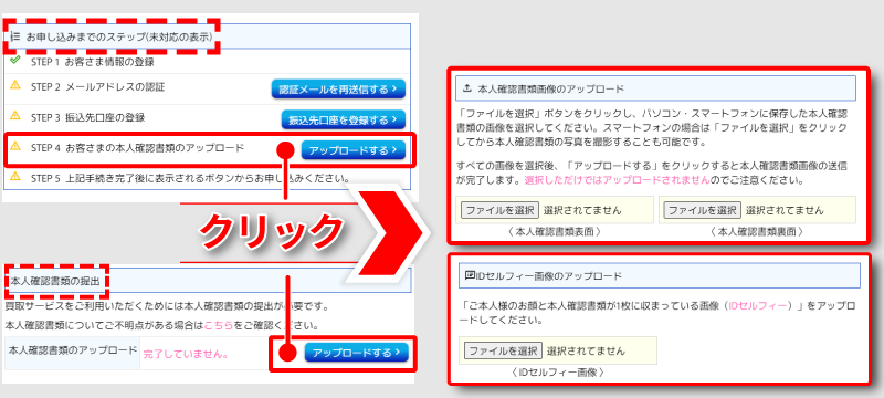 マイページトップの「お申し込みまでのステップ」または「お客さま情報」ページにあるリンクから、本人確認書類画像のアップロードページへアクセスしてください。