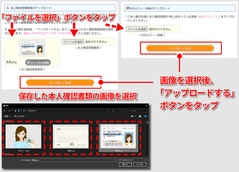 すべての画像を選択後、「アップロードする」ボタンをクリックし、本人確認書類画像をアップロードしてください。