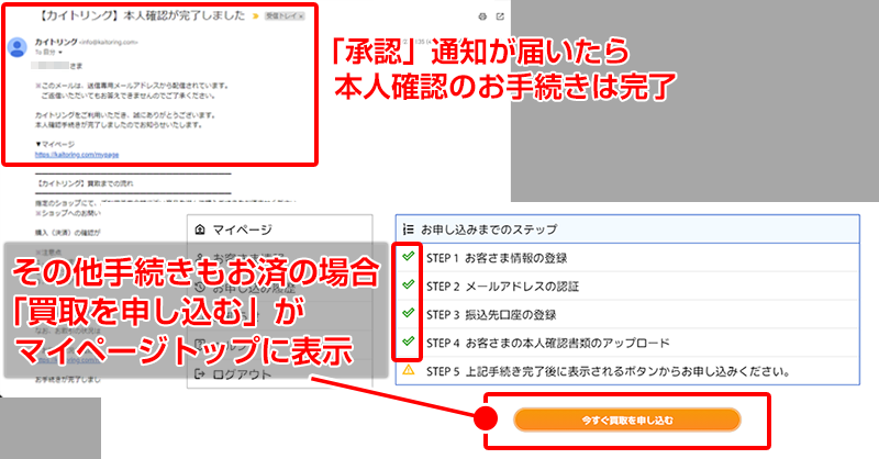 その他のお手続きもお済みの場合は、承認通知と同時に「買取を申し込む」というボタンがマイページ内に表示されます。(ボタンが表示されない場合は、ページを更新してください)。
