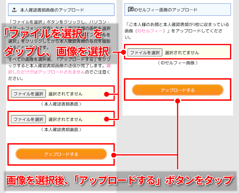 「ファイルを選択」ボタンをタップし、保存した本人確認書類の画像の「表面」「裏面」「お顔が写っているもの(IDセルフィー)」の3点を選択してください。