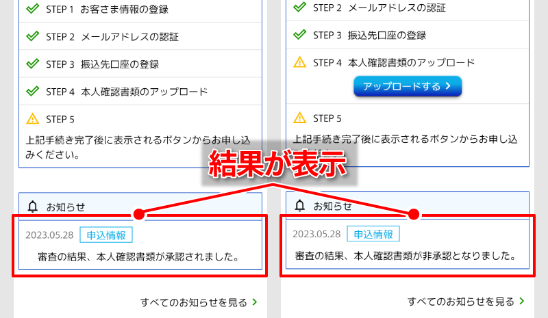 アップロードいただいた画像を元に、当社にてお客さまの本人確認作業を行い、メールおよびマイページにてその結果をお知らせいたします。