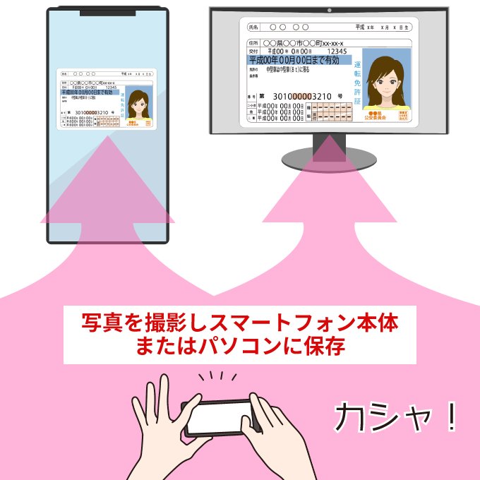 まずはスマートフォンやデジタルカメラ等で本人確認書類の写真を撮影し、スマートフォン本体またはパソコンに保存してください。